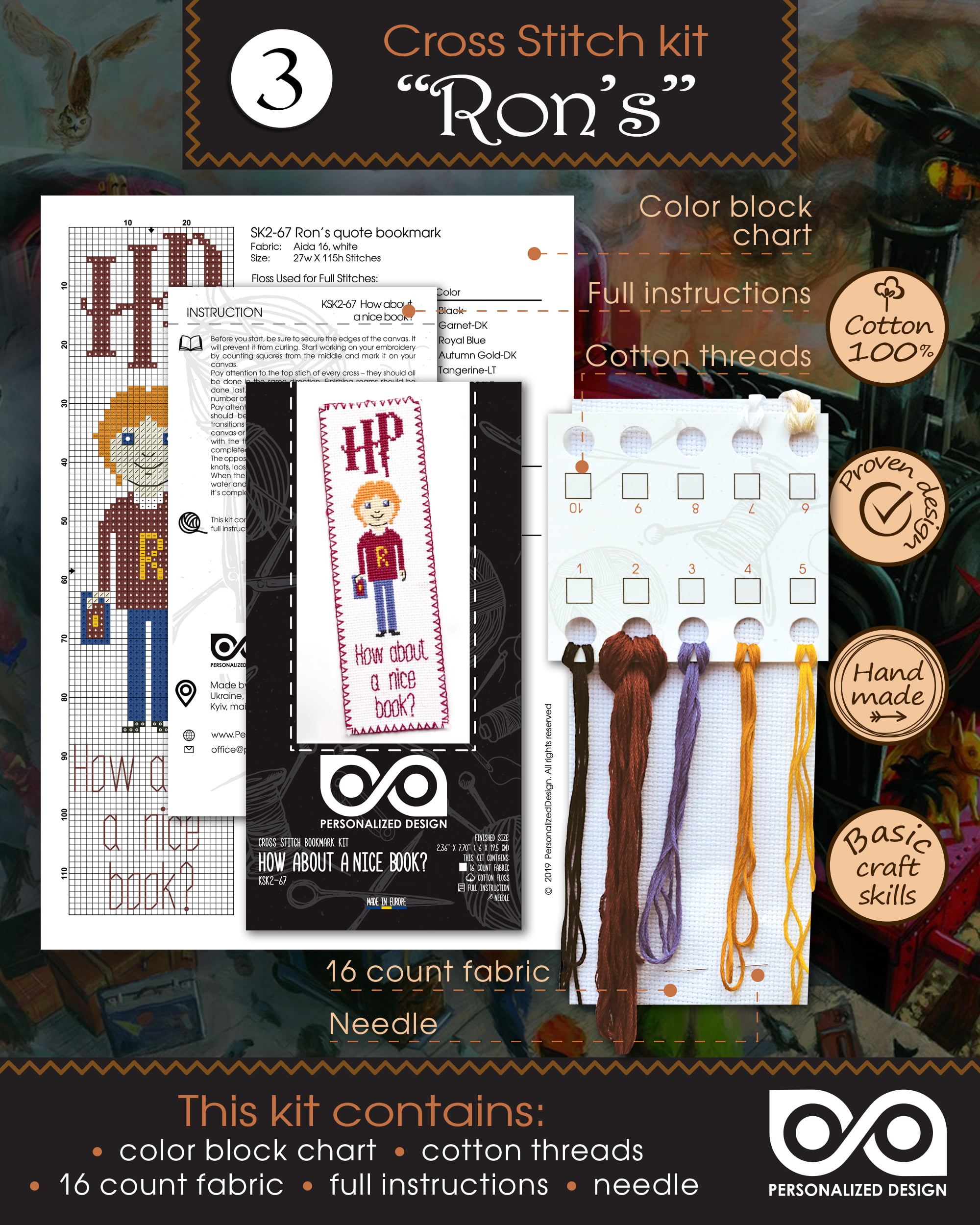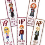 Set of 5 embroidery bookmark kits with HP quotes about friendship displays incantations used by characters of Potterina: