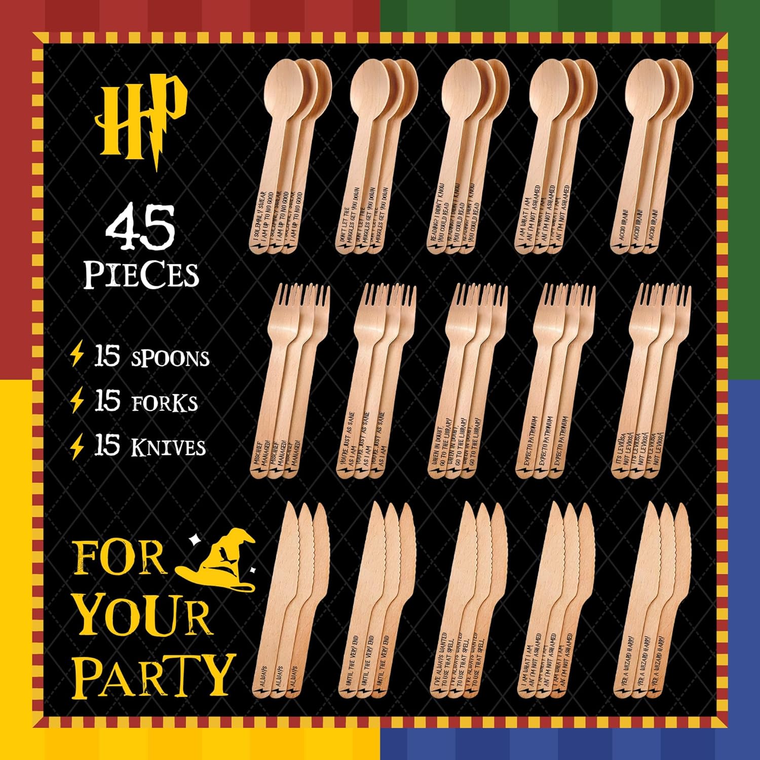 🍴 45 utensils total to serve 15 guests: 15 forks, 15 knives, 15 spoons. 33 quotes printed in black + 12 pieces with Hogwarts house color stripes (3 forks / 3 knives / 3 spoons each for Gryffindor, Slytherin, Hufflepuff, and Ravenclaw).