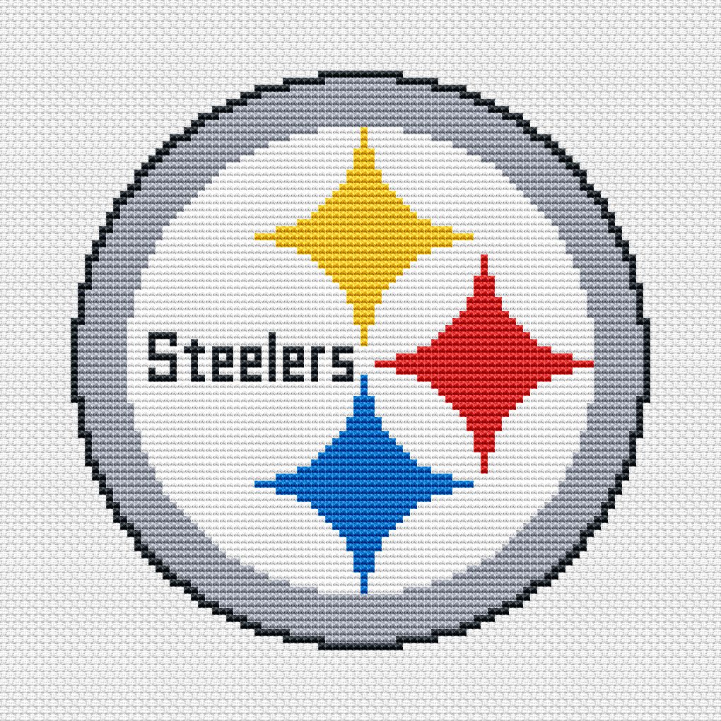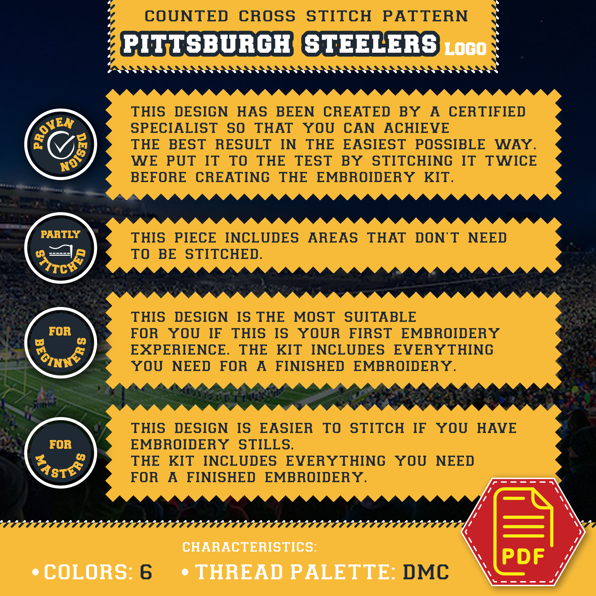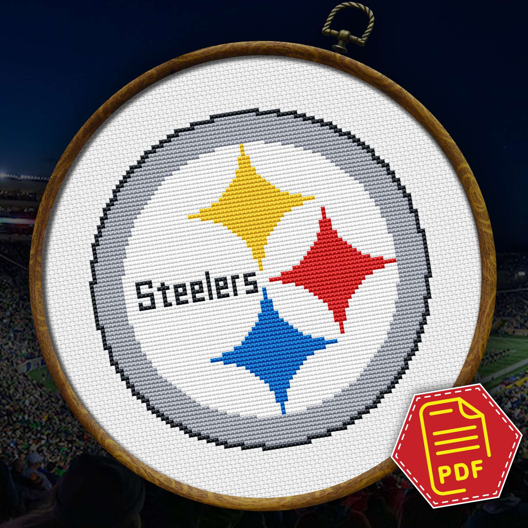 Pittsburgh Steelers logo cross stitch pattern, available for instant download as a 5-page PDF file.