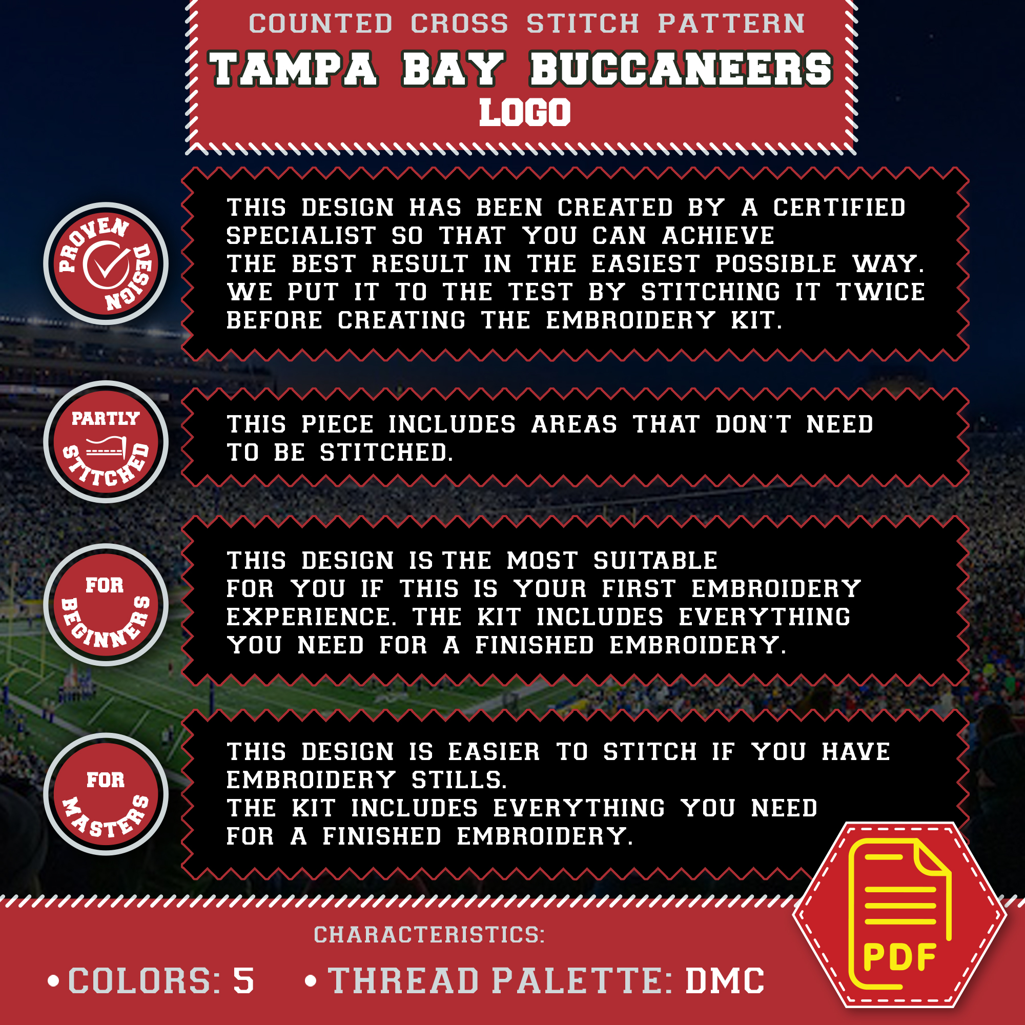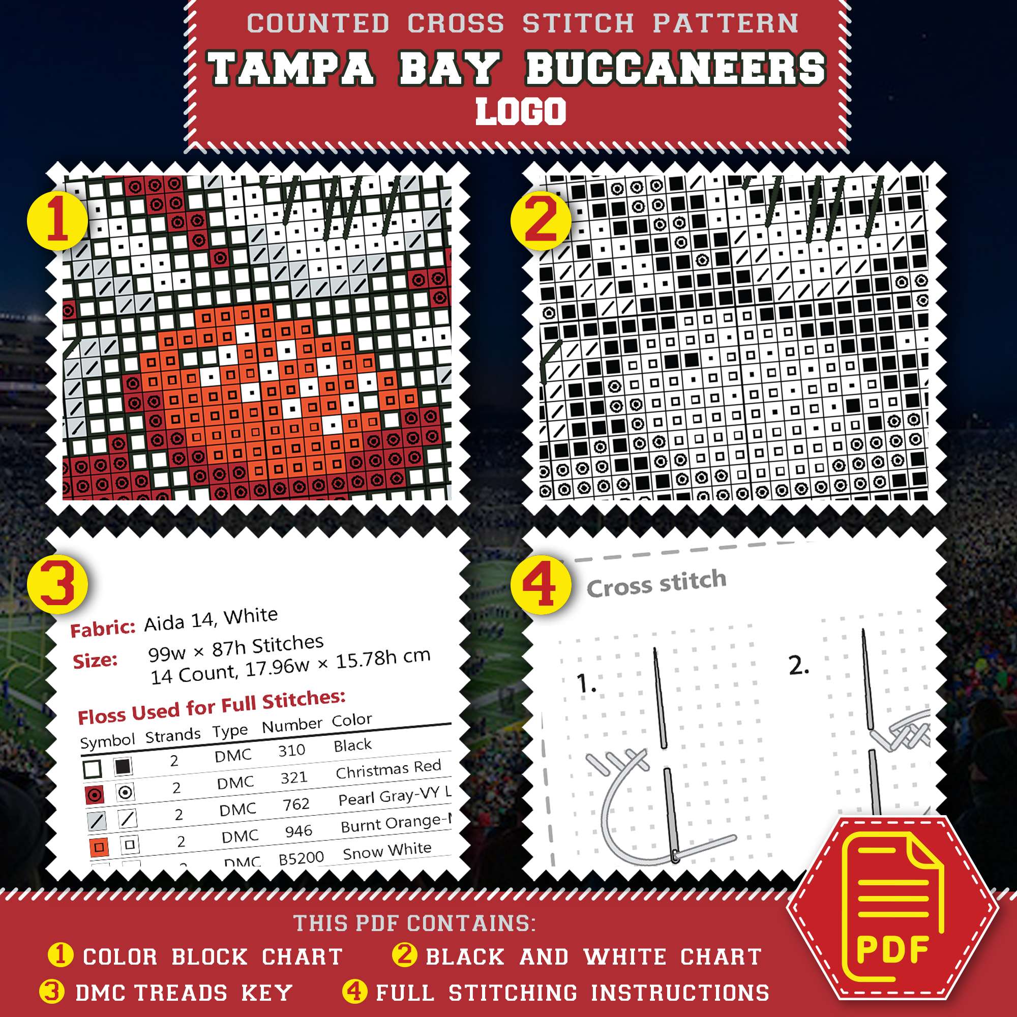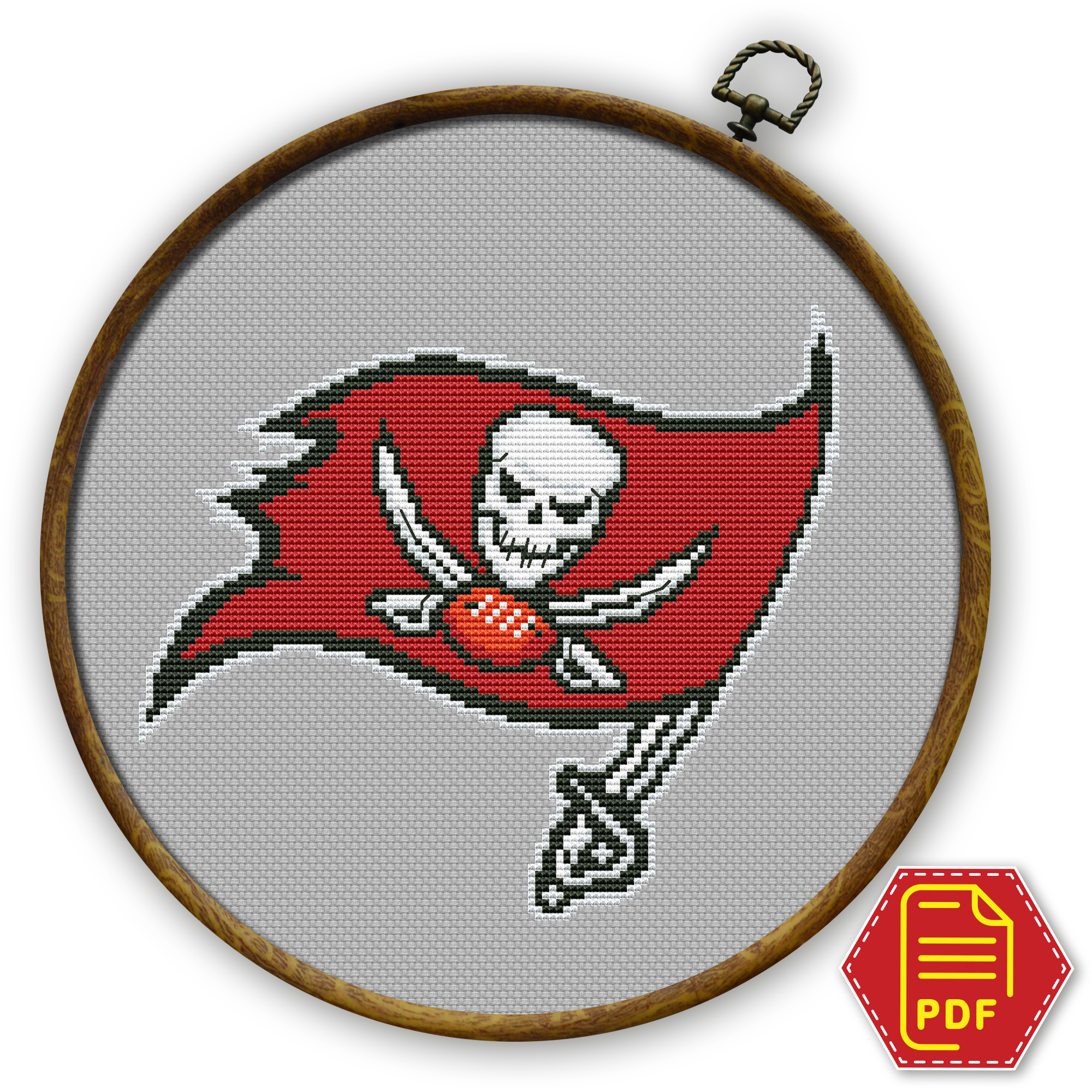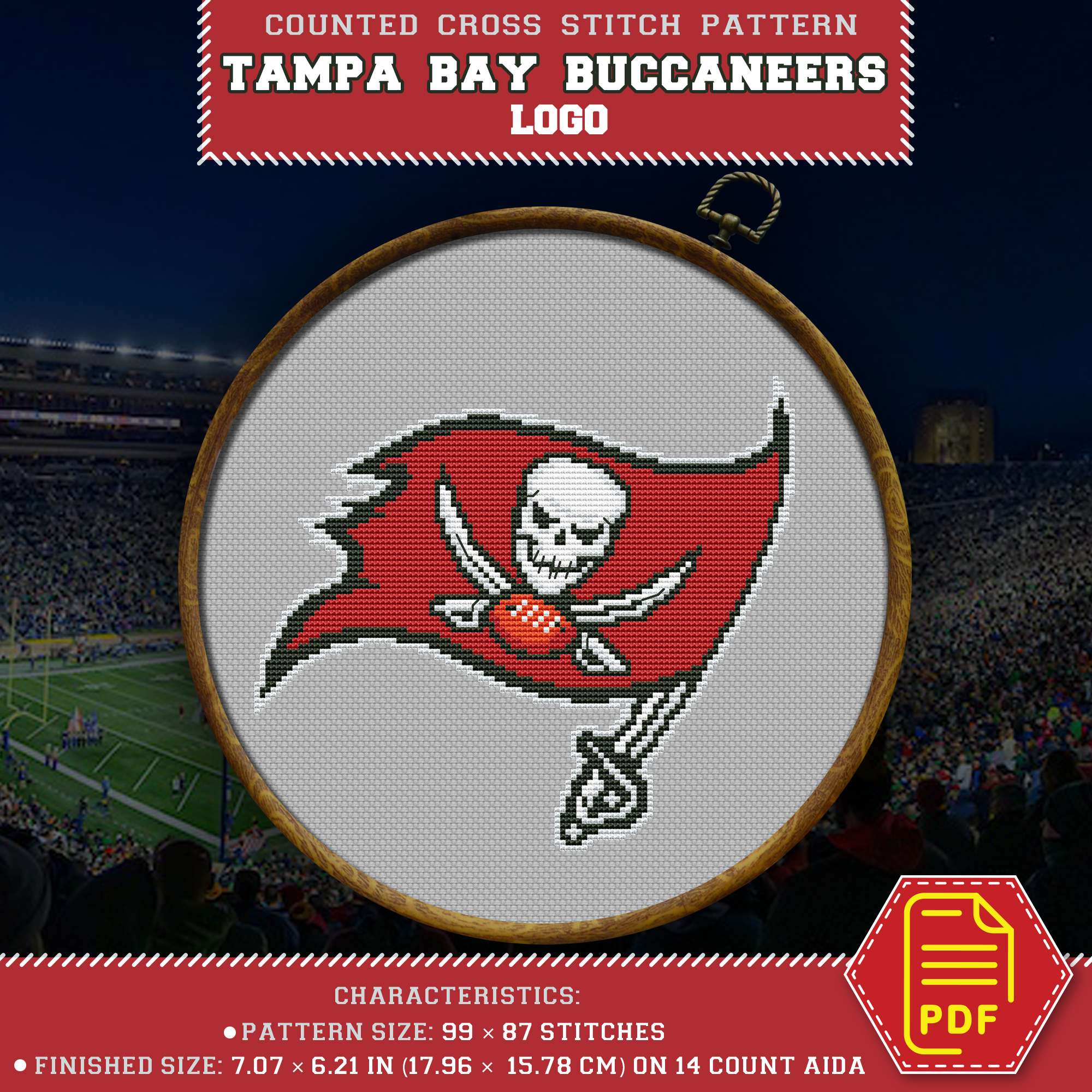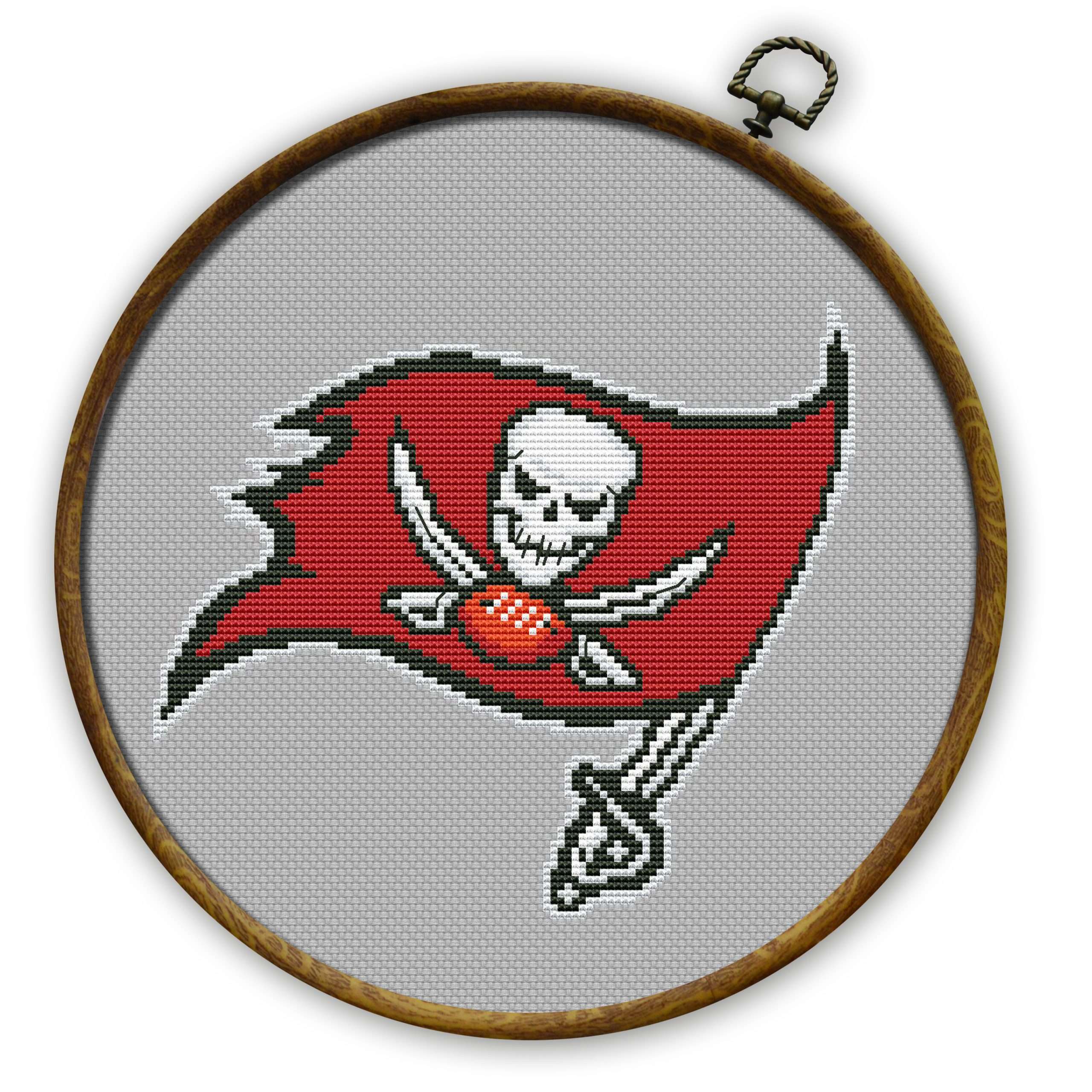 Tampa Bay Buccaneers insignia cross stitch pattern, available for instant download as a 5-page PDF file.